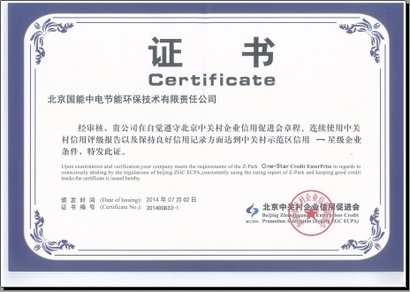 當(dāng)前位置: 國能中電公司動態(tài)> 熱烈祝賀我公司榮獲“中關(guān)村示范區(qū)信用一星級企業(yè)證書”